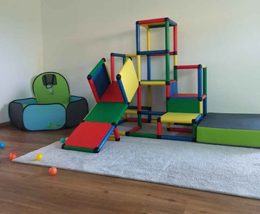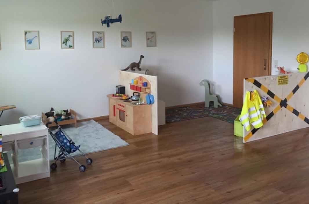 Unser großes Spielzimmer ist in verschiedene Bereiche aufgeteilt, wie z.B. eine Kletterecke, Baustelle, Kochbereich, Einkaufsladen etc.